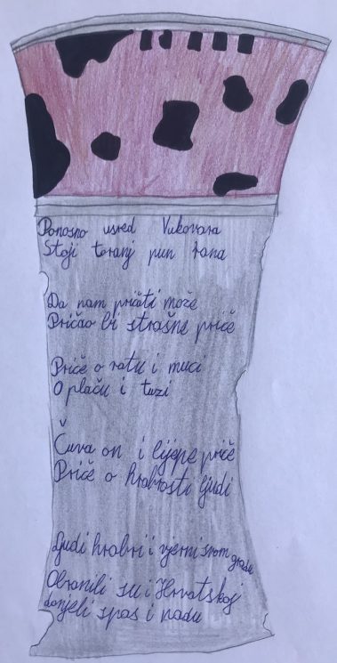 Proučavajući prošlost Republike Hrvatske, učenici 4.c razreda sa svojom su učiteljicom osmislili niz aktivnosti koje su provodili na različitim nastavnim predmetima. Svoj doživljaj prikazali su kaligramima – pjesmama koje su napisane tako da grafički (svojim oblikom) prikazuju osnovni motiv pjesme. Pomoću folija, recikliranjem izradili su krune hrvatskih vladara (kakve su nekoć bile i kakve bi mogle biti). Proučili su i zapisali biografije znamenitih osoba koje su izvukli tombolom, odjenuli se u iste te se predstavili monologom. Nakon predstavljanja složili su se u živu lentu vremena.