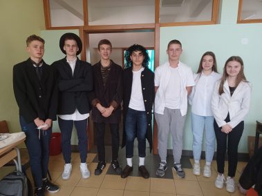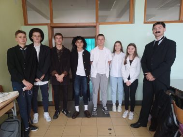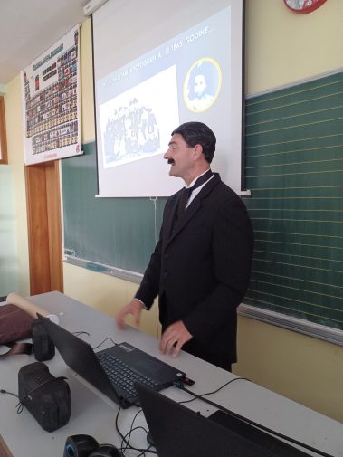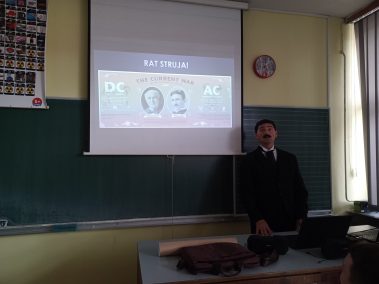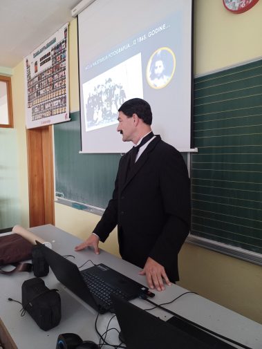 Zapravo nas je toga dana posjetio gospodin Boris Šušnjar, licencirani turistički vodič, koji je odjeven u Nikolu Teslu učenicima održao predavanje u sklopu projekta “Šetnja s Nikolom Teslom”. Predavanju je prethodilo izlaganje osmaša koji su, također maskirani i odjeveni u poznate hrvatske, ali i svjetske izumitelje, u prvom licu svojim kolegama iz razreda i svojim učiteljima prezentirali po čemu pamtimo znanstvenike i izumitelje koje su odabrali za svoje izlaganje. Prezentirali su Andriju Mohorovičića, Dmitrija Ivanoviča Mendeljejeva, Francisa Cricka i Jamesa Watsona, Vjekoslava Meichsnera, Ignaza Sammelweisa i Isaaca Newtona.