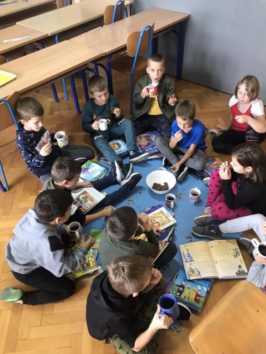 Učenici prvih razreda sa svojim su učiteljicama Lidijom Čakarić i Vlatkom Pavlović-Kraljević organizirali čajanku i prezentirali najdraže slikovnice. Zatim su izrađivali straničnik s najdražim likom i počeli su posuđivati knjige iz “razredne knjižnice” koje su im preporučili prijatelji iz razreda te su ih čitali s roditeljima kod kuće. Naučili su kako se ponašati u knjižnici, obogatili su svoj rječnik novim, njima dosad nepoznatim riječima, stekli su nova znanja i iskustva, razvili kreativnost i maštu te korisno proveli vrijeme.