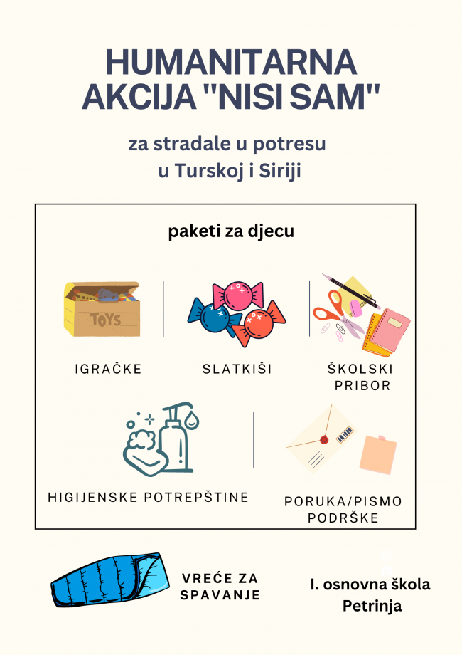 I. osnovna škola Petrinja pokreće humanitarnu akciju “Nisi sam” za stradale u potresu u Turskoj i Siriji. Akcija traje do 10. ožujka 2023. godine. Naši učenici pripremit će pakete za djecu koja su nastradala u potresu. Sudjelovanje je dobrovoljno i svi će sudjelovati koliko mogu. Budući da su paketići namijenjeni djeci, u paketiće se mogu…