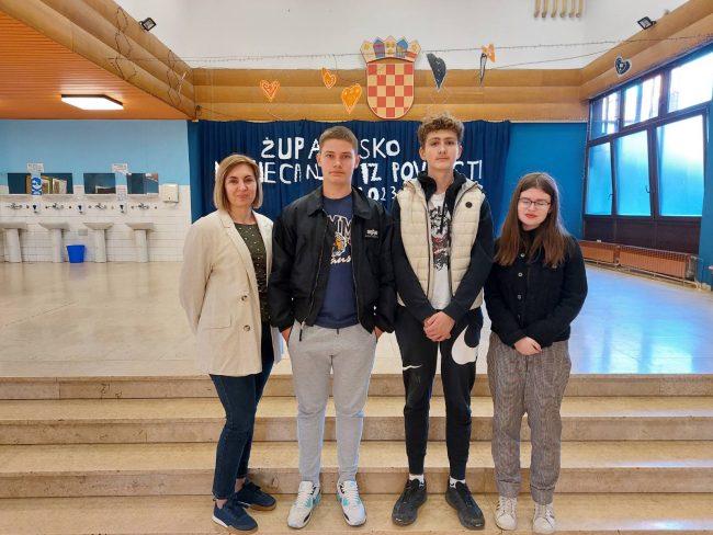 Dana 14. ožujka 2023. godine naši su učenici 8. razreda u pratnji mentorice Marice Jozić sudjelovali na županijskom natjecanju iz povijesti. Na županijsko natjecanje plasirali su se nakon odličnih rezultata na školskoj razini. Čestitamo Lani Đureković, Dominiku Išeku, Antoniju Josipu Gašparu i njihovoj mentorici.