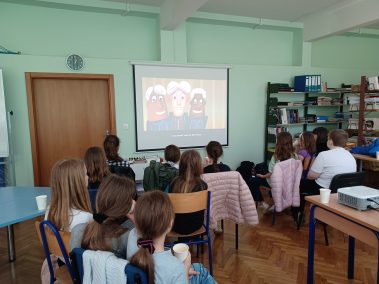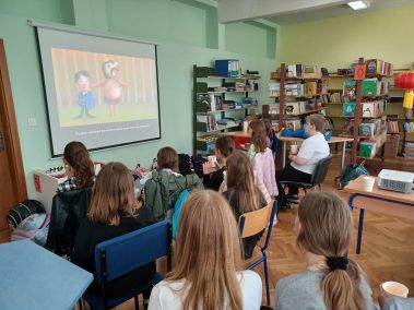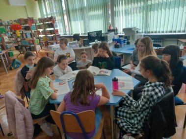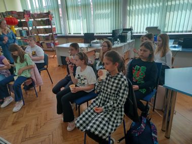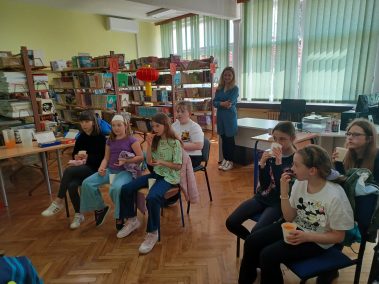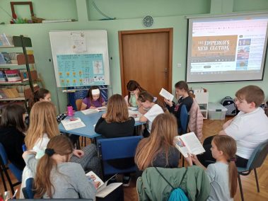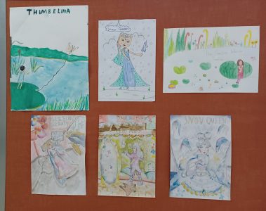 Nakon crtanja naslovnica trebalo je poneku bajku i pročitati pa su učenici posjetili školsku knjižnicu i tamo organizirali književnu čajanku. Čitali su bajke “Carevo novo ruho” i “Kraljevna na zrnu graška”, a zatim su pogledali i poslušali bajku “The Emperor’s New Clothes”. Uz slatke napitke i keksiće ugođaj je bio potpun, a doživljaj još veći.
