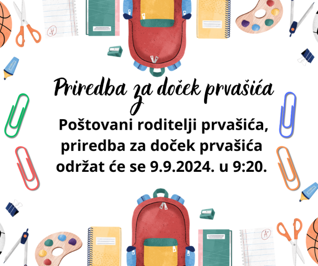Priredba za doček prvašića Naše aktivnostiBy Anamaria Titijevski Vidović29 kolovoza, 2024Poštovani roditelji prvašića, priredba za doček prvašića održat će se 9.9.2024. u 9:20.