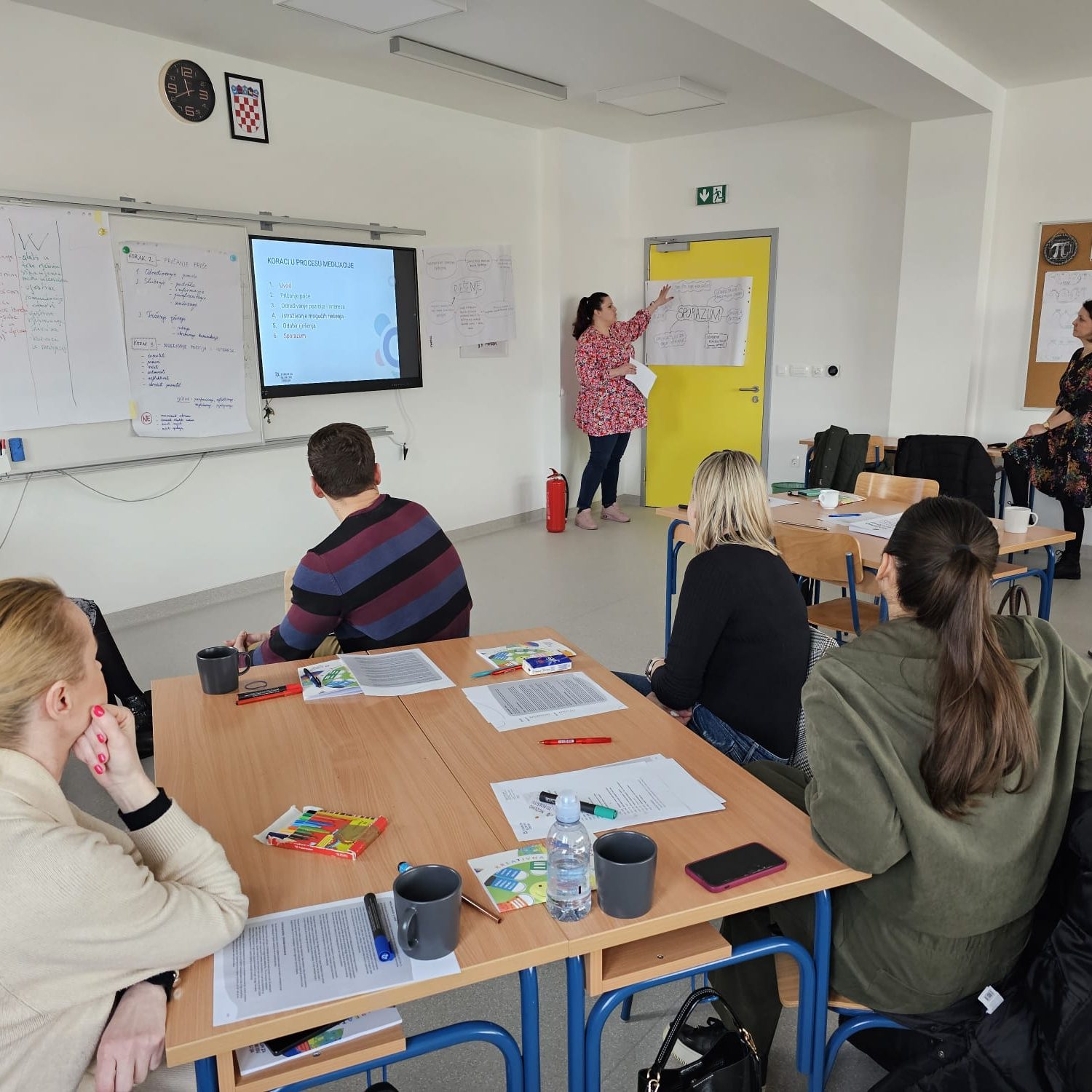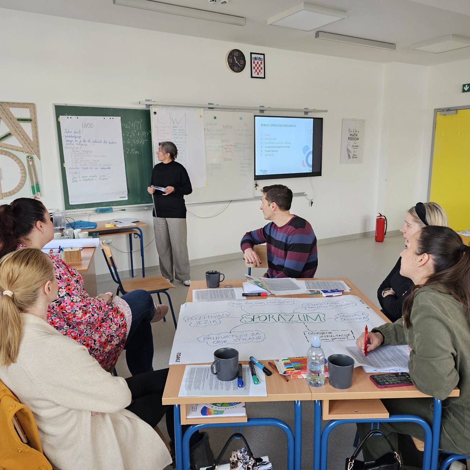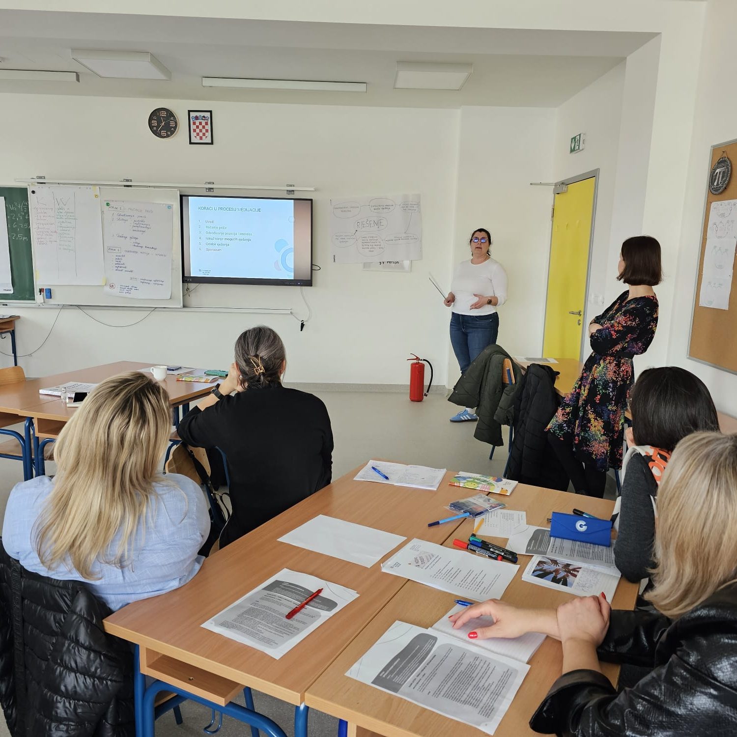 U sklopu projekta Zdrava komunikacija=zdrava glava koji su osmislile učiteljica geografije Marija Ros Kozarić i pedagoginja Anamaria Titijevski Vidović, a za čije su financiranje dobile sredstva Ministarstva znanosti, obrazovanja i mladih, u četvrtak 27.2. i u petak 28.2.2025. u našoj školi održan je Osnovni seminar medijacije. Edukaciji su prisustvovali učitelji naše škole i stručna suradnica socijalna pedagoginja, a vodile su ga trenerice Ana Šimić i Helena Šikić. Tijekom dva dana učili su o sukobu, što je sve bitno kako bi sukob razumjeli, o tome kako komunicirati u sukobu i sa sukobljenima te naposljetku korake u samom postupku medijacije što su imali prilike i vježbati. Vjerujemo da su sudjelovanjem u ovoj edukaciji učitelji imali prilike razvijati svoje komunikacijske i emocionalne vještine te će ta znanja moći prenositi na svoje učenike.