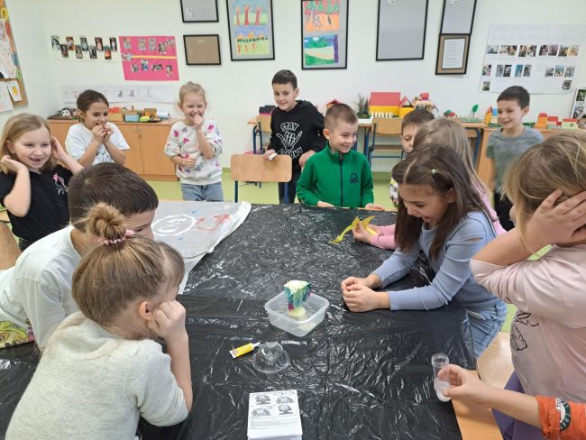 Učenici produženog boravka, zajedno s učiteljicama, sudjelovali su u izvođenju različitih pokusa. Kroz zanimljive eksperimente, poput erupcije vulkana, razigrane lampe, ‘plesa’ grožđica i balona koji samostalno stoji, istraživali su čaroliju znanosti. S velikim oduševljenjem i znatiželjom pratili su svaki pokus, učeći kroz igru i vlastito iskustvo.