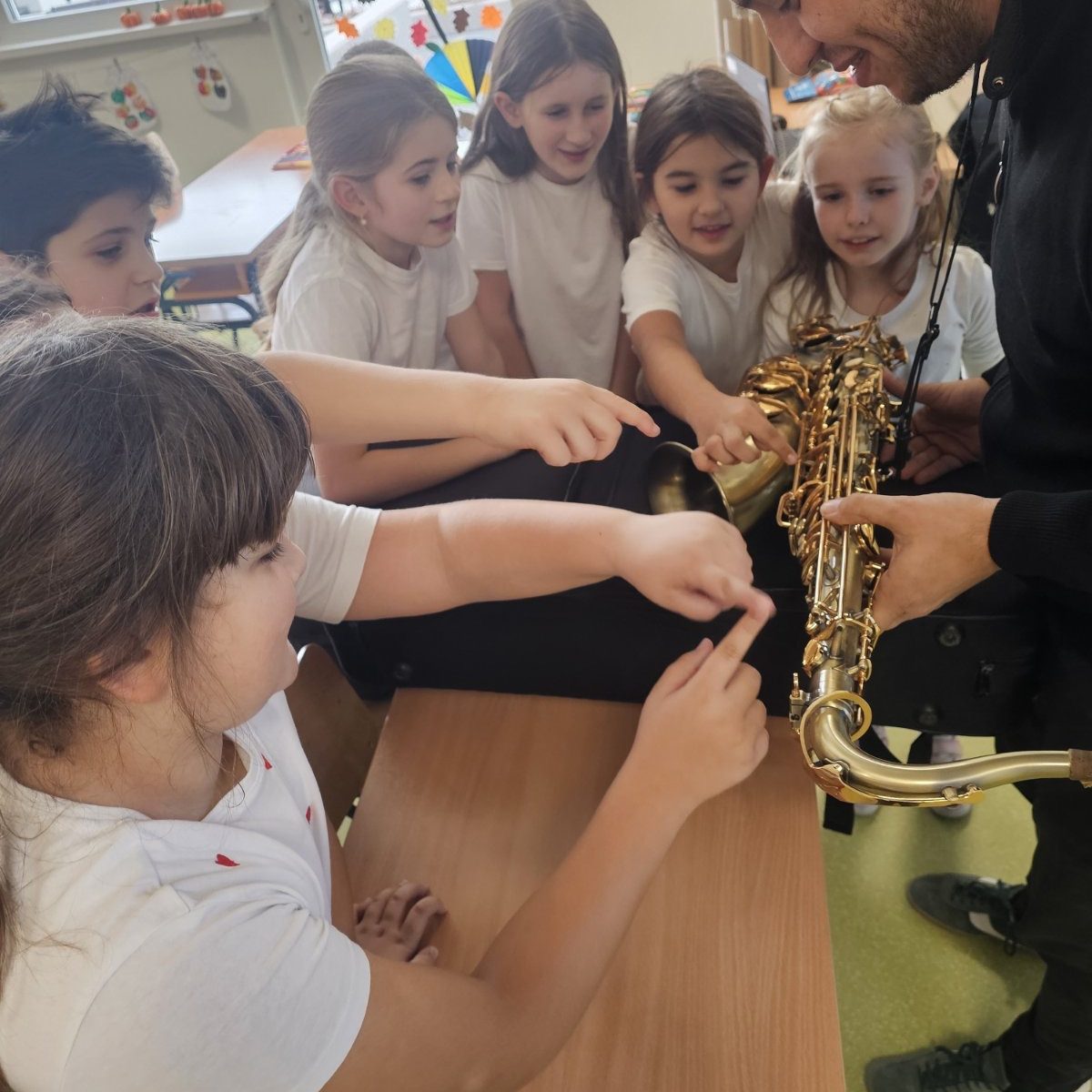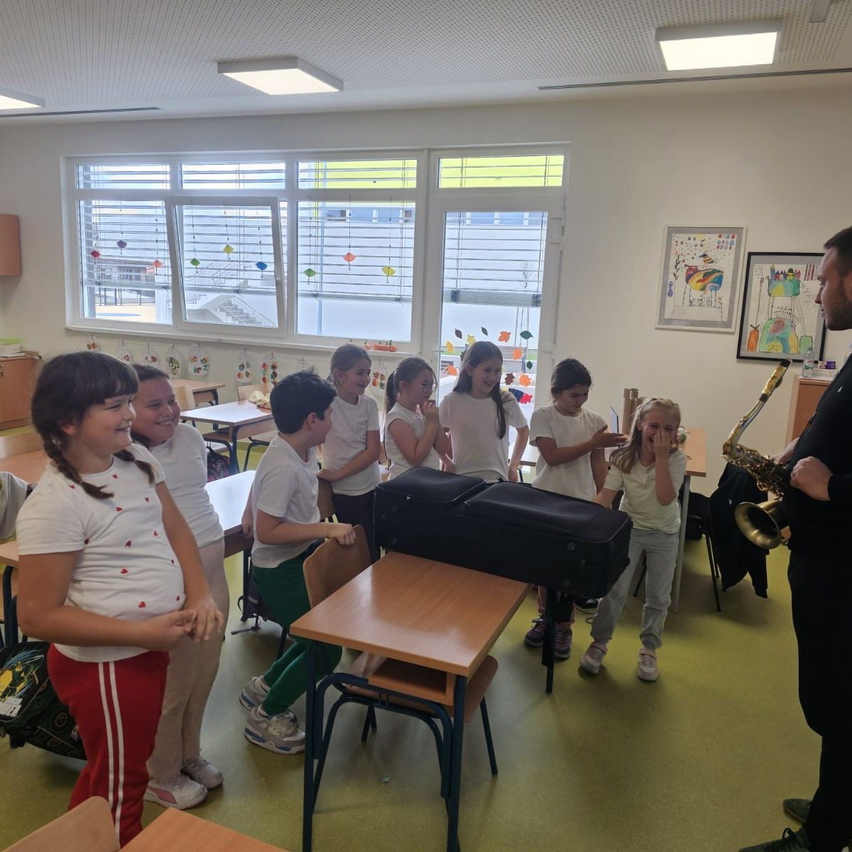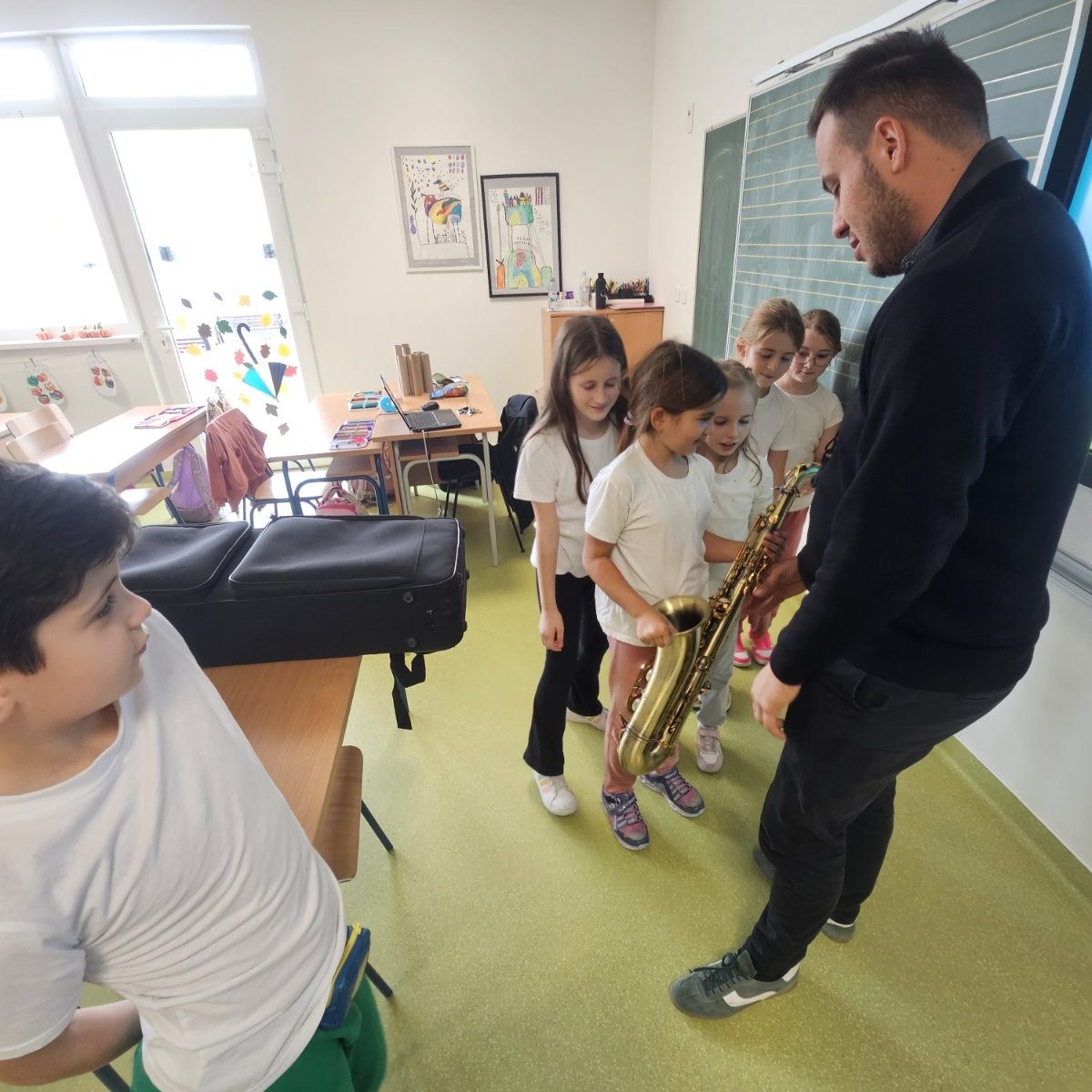 Na izvannastavnoj aktivnosti “Glazbena radionica” učitelja Filipa Dumbovića, učenike je u srijedu 29.10. posjetio Fran Komlinović, član Gradske limene glazbe, kako bi im prezentirao drveni puhački instrument, saksofon.