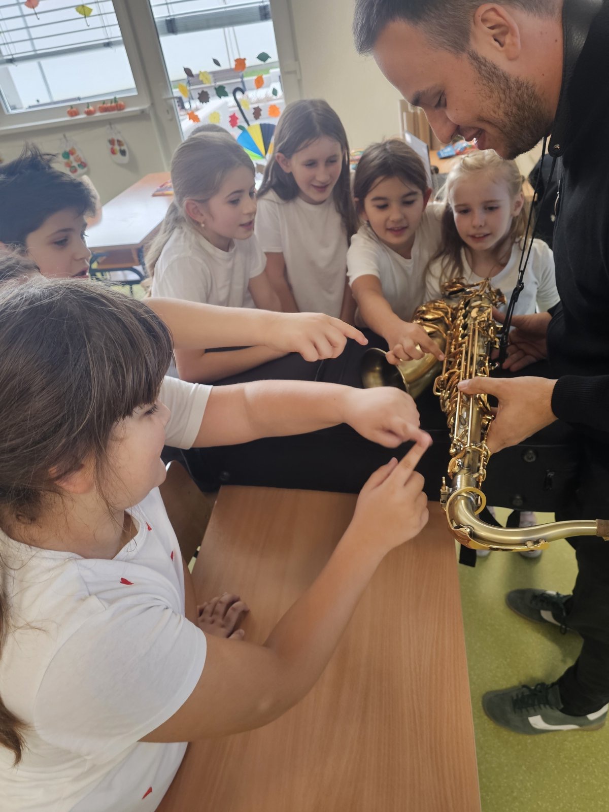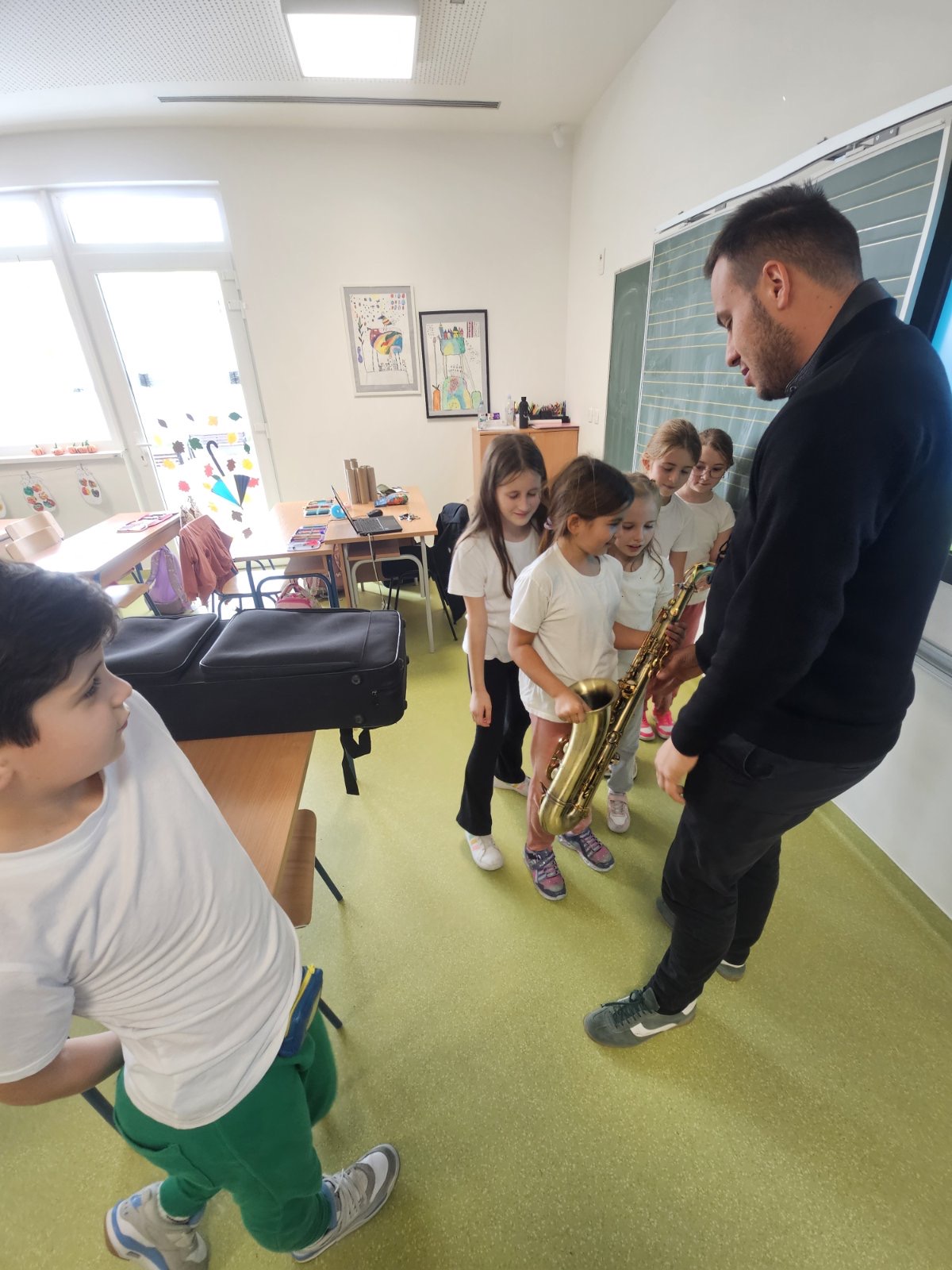 Na izvannastavnoj aktivnosti “Glazbena radionica” učitelja Filipa Dumbovića, učenike je u srijedu 29.10. posjetio Fran Komlinović, član Gradske limene glazbe, kako bi im prezentirao drveni puhački instrument, saksofon.