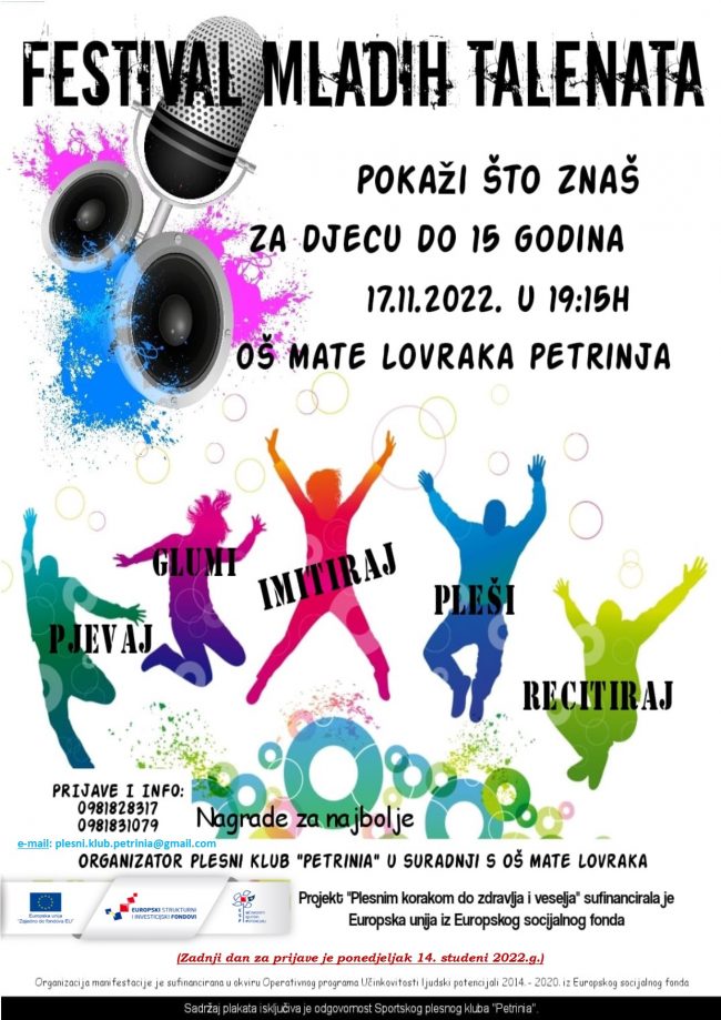 U tijeku su prijave za sudjelovanje na 2. Festivalu mladih talenata koji će se održati 17. studenog 2022. godine s početkom u 19:15 sati u OŠ Mate Lovraka. Prijaviti se mogu svi osnovnoškolci s područja grada Petrinje. Ako imaš talent koji bi želio/željela pokazati, voliš pjevati, plesati, svirati, glumiti, prijavi se najkasnije do 14. studenog…