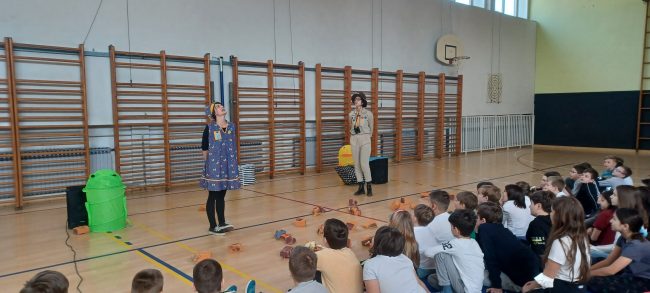 U ponedjeljak 4. travnja posjetili su nas glumci iz Boom! teatra koji su za naše učenike razredne nastave odigrali predstavu “Velika staklena avantura”. Ugostili smo ih u PO Hrastovica i u OŠ Dragutina Tadijanovića u kojoj smo trenutno gosti. Učenici su, gledajući predstavu, naučili što je recikliranje, kako se odlaže otpad te zašto su spremnici…