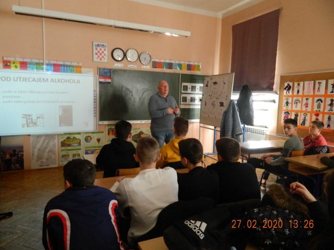 U našoj školi 27.02. 2020 . održano je predavanje o prevenciji ovisnosti u sklopu projekta “Zdrav za 5” koji je dio našeg Školskog preventivnog programa . Predavanju su bili nazočni učenici 8. razreda zajedno sa svojim razrednicama. Danas je bilo riječi o prevenciji alkohola. Nosioci predavanja su djelatnici Ministarstva unutarnjih poslova.