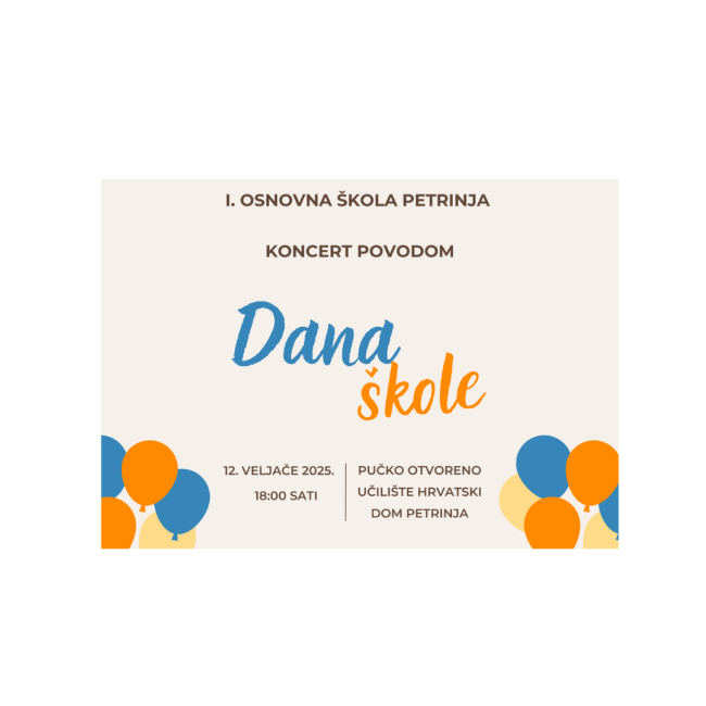 U Pučkom otvorenom učilištu Hrvatski dom Petrinja, u srijedu, 12. veljače, u 18 sati održat će se koncert povodom Dana naše škole. Veselimo se vašem dolasku!